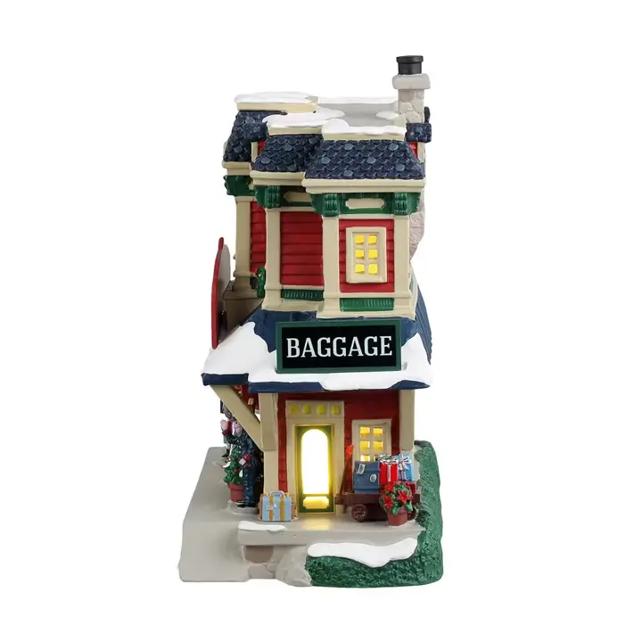 Ben jij op zoek naar een sfeervol treinstation voor jouw kerstdorp? Holly Jolly Junction is een feestelijk vormgegeven station waar reizigers tijdens de kerstperiode aankomen en vertrekken. Het gebouw is gemaakt van porselein en heeft ingebouwde verlichting, waardoor het ook ’s avonds goed opvalt. Aan de voorzijde zijn herkenbare details te zien, zoals een bord met “Tickets” en “Baggage”, wat duidelijk maakt dat dit gebouw dienstdoet als echt station. De vrolijke kerstversieringen, het besneeuwde dak en de klassieke bouwstijl maken dit huisje een perfecte toevoeging aan een spoorlijn of dorpsrand. Combineer dit station bijvoorbeeld met de Caddington Regional Railroad, een perron of figuren zoals reizigers met koffers. Het huisje is geschikt voor binnengebruik en wordt geleverd met een adapter.