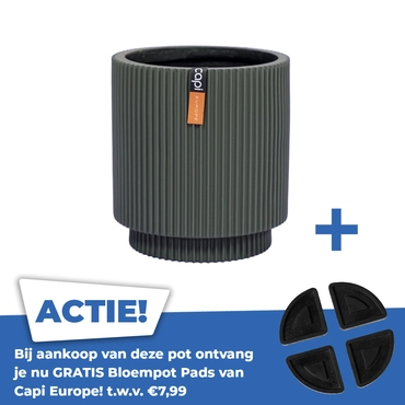 De Vaas cilinder groove d19h21cm groen is een prachtige vaas uit de nieuwe Capi groove serie. De pot is gemaakt van sterk kunststof materiaal. Door zijn prachtige mat groene uiterlijk heeft de vaas een elegante uitstraling en zorg je ervoor dat je een echt pareltje in huis haalt. De textuur die je op de vaas ziet, zijn geïnspireerd op de groeven die in bergen en stenen ontstaan in de loop van de jaren door de natuur. Het symboliseert de grote veranderingen van de natuur. De vaas wordt met de hand gemaakt, waardoor hij niet 100% waterdicht is. Wij raden je dan ook aan om een binnenhoes te gebruiken. Doordat de vazen met de hand gemaakt worden kunnen kleuren en het formaat hierdoor een klein beetje afwijken. Elke vaas is daardoor uniek.